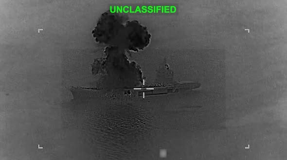 กองทัพสหรัฐฯ เปิดภาพการโจมตี เรือบรรทุกโดรนของอิหร่าน ซึ่งมีขนาดพอๆ กับเรือบรรทุกเครื่องบินในสมัยสงครามโลกครั้งที่สอง จากภาพเรือลำดังกล่าวถูกโจมตีและเกิดเพลิงลุกไหม้อย่างหนัก
